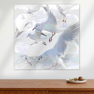 Seagulls capture something effortlessly free. Wings spread wide, feet dangling mid-flight, or perched quietly along weathered wood - these coastal birds bring movement and calm to any space. Whether you're drawn to the soft watercolor washes in Seagulls by the sea or the dreamy surrealism of seaside moments, seagull art fits beautifully into modern, coastal, and Scandinavian interiors.