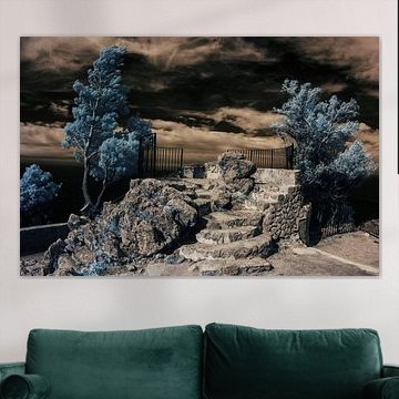 Stairs artworks carry calm and mysterious moods that pair beautifully with neutral textiles and subtle lighting. Create depth by combining these pieces with wooden accessories or metal-framed mirrors that echo the architectural lines. A gallery wall mixing different stair perspectives adds visual rhythm to an entryway or landing, while a single large piece makes a bold statement. Let the nostalgic atmosphere guide your choices - soft throws, ceramic vases, or vintage objects complement the contemplative character of stairs imagery wonderfully.