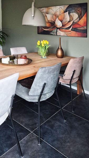 Beige and taupe create a soft foundation that works across most interiors. Layer in terracotta or brown through cushions, throws, or wooden furniture to echo the warmth. The earthy palette in Lotus Abstract pairs naturally with linen textures and matte ceramics in similar tones.