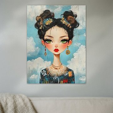 Surrealist portraits with vibrant skies work beautifully in rooms where you want to spark conversation and curiosity. The bold blue background and whimsical details in Magic glasses suit a creative workspace, hallway, or reading corner where the playful imagery can be appreciated up close.
