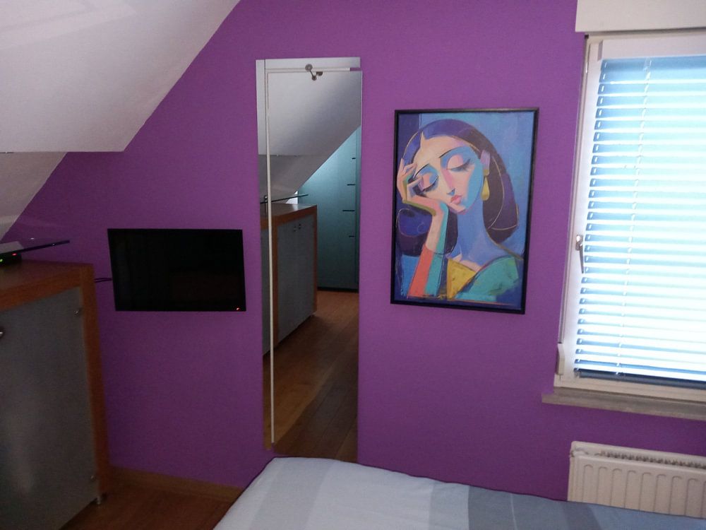 Violet artworks add character to contemporary living spaces without overwhelming the room. They work particularly well against light-colored walls where the purple tones stand out clearly. The mix of violet and teal in Pop Art - Air Plane brings depth to modern interiors.