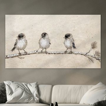 Three funny little birds on a twig of a Larix tree by Studio Pieternel