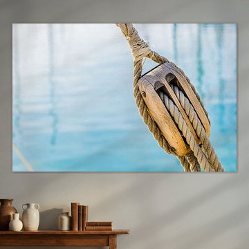 Pulley with ropes of a classic sailing boat and blue sea water by Alex Winter