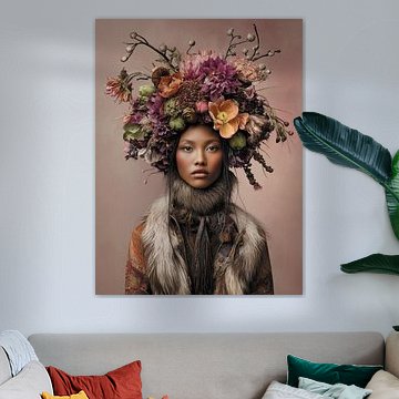 Een betoverende digitale creatie die een vrouw uitbeeldt, volledig versmolten met een weelderige bloemenzee. Haar haar vloeit als een waterval van bloemblaadjes, elk blad in een andere tint, variërend van dieppaars tot stralend geel. Haar ogen stralen de levendige kleuren van de natuur uit, alsof ze de schoonheid en de levenskracht van de bloemen in zich meedraagt. De vrouw lijkt te ademen in harmonie met de flora om haar heen, waarbij elke beweging een subtiele dans is die de natuur viert. Deze symbiose van mens en flora creëert een visie van perfectie, waar de grenzen tussen de menselijke en natuurlijke wereld vervagen. De Bloemenvrouw is niet alleen een afbeelding, maar een levende ode aan de schoonheid en de kracht van de natuur, die ons herinnert aan onze verbondenheid met de aarde.