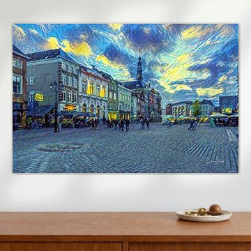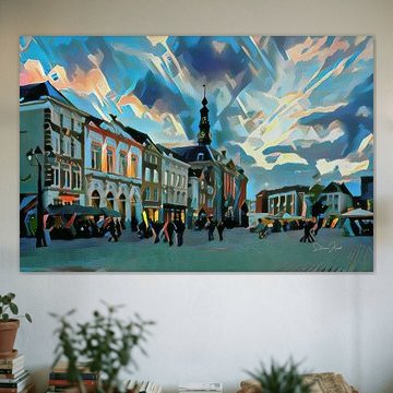 Creatieve weergaves van de stad Den Bosch, gemaakt met behulp van kunstmatige intelligentie. Innovatie kunst met een uniek karakter. Dat is Slimme Kunst. Ons algoritme beheerst verschillende schilderstijlen, van abstract tot impressionistisch. Zo kiest u de stijl en kleurstelling die u mooi vindt. Het moderne tintje van kunstmatige intelligentie krijgt u bovendien altijd! Doe ook mee met de trend en kies één van onze kunstwerken :) De herkenbare plekken van 's Hertogenbosch zijn 'geschilderd' door ons algoritme. Sfeervolle werken met een hoofdrol voor de Sint Jan. Een kunstwerk met de Sint-Janskathedraal of de Markt brengt Den Bosch letterlijk in huis! Zoekt u een stijlvol schilderij van 's Hertogenbosch voor in uw woonkamer? Onze kunst is kleurrijk en geeft uw interieur een boost! Wilt u liever Slimme Kunst van andere steden? Wij hebben ook prachtige schilderijen van Groningen, Den Haag, Deventer, Nijmegen en Rotterdam, Maastricht, Utrecht, Delft, Leiden en Amsterdam.