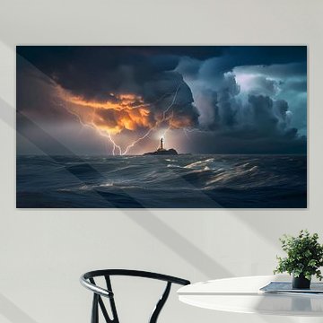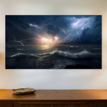 Storms at sea can be some of the most awe-inspiring and terrifying natural phenomena on Earth, and this artwork captures the intense power and energy of a storm with lightning. The piece depicts towering waves, crashing against each other and creating a frothy white foam. Above, the sky is dark and turbulent, with heavy clouds and flashes of lightning illuminating the scene. The lightning bolts themselves are rendered in great detail, crackling with energy and illuminating the surrounding clouds with their intense light. The overall mood and atmosphere of the artwork is one of chaos and danger, with the viewer left to contemplate the raw power of nature and the fragility of human life in its midst.