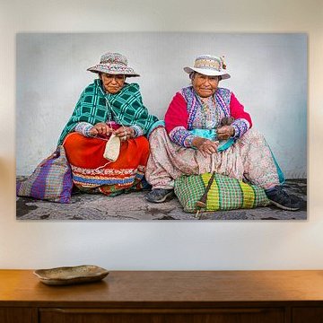 Two hands working women in traditional dress at Chivay, Peru