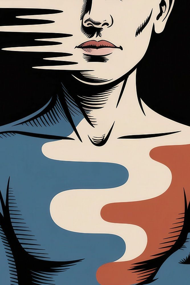 Meet a bold, modern statement piece that balances emotion and design. This abstract figure in red, rust, and layered blues feels like a person mid-thought, gently dissolving into textured shapes as if memory and identity are drifting into the dark. Set against a deep black background, the clean vector-like forms and flat color blocks…