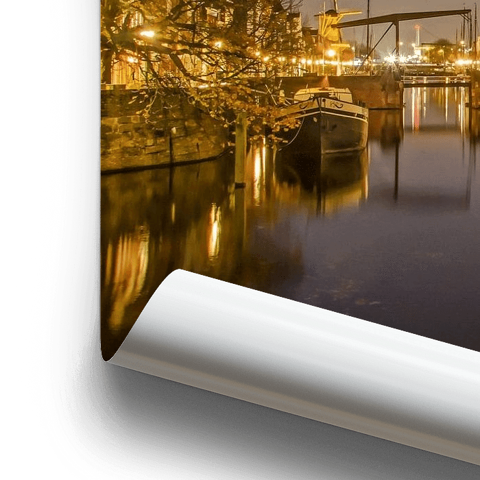 One of the most photogenic places in Rotterdam, the Aelbrechtskolk in Delfshaven. Captured in the blue hour after sunset on an almost windless evening in November. With characteristic canal houses, historic barges and whimsical chestnut trees. Further in the background the Piet Heyns bridge, the Pilgrim's Church and windmill the Distillerketel. And in the almost cloudless sky a striking phenomenon: a conjunction of the Moon, Jupiter and Saturn.