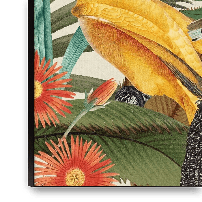 A wonderfully cheerful, summery, tropical and multicoloured collage with vintage images of birds, flowers and plants.