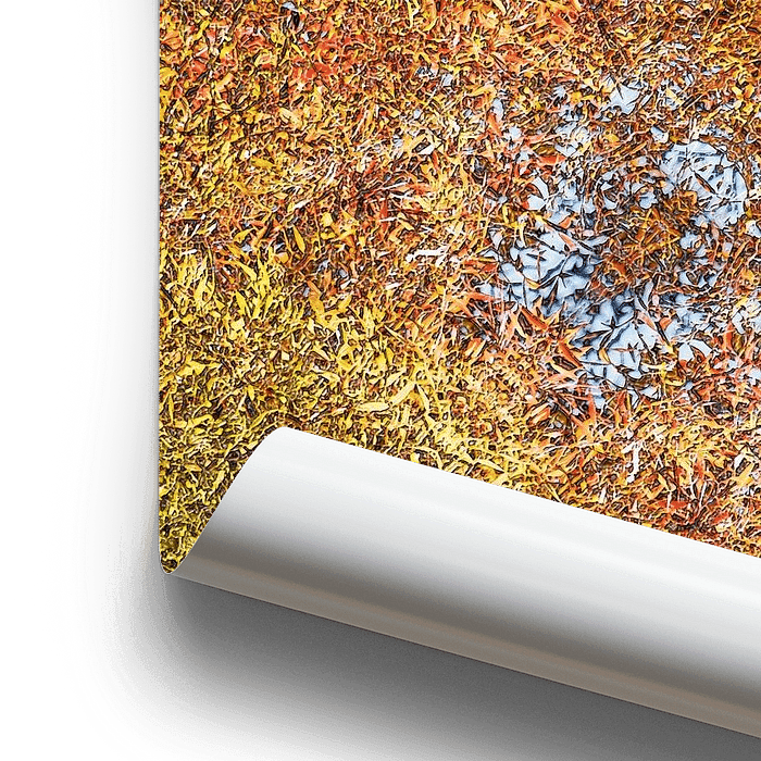 A kaleidoscopic image with a strong symmetry and a geometry reminiscent of a Celtic cross, based on a photograph of trees in all the colours that make autumn so pleasing to the eye: green, yellow, orange, red and brown.