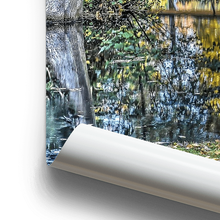 There is much to see on this autumn photo, made in the Museumpark in Rotterdam: the yellow-brown leaves on the ground, the trees, partly discolored and partly still green, the graceful arc of the pond's edge, the footbridge that seems to float freely, the reflections of all this in the unruffled water.