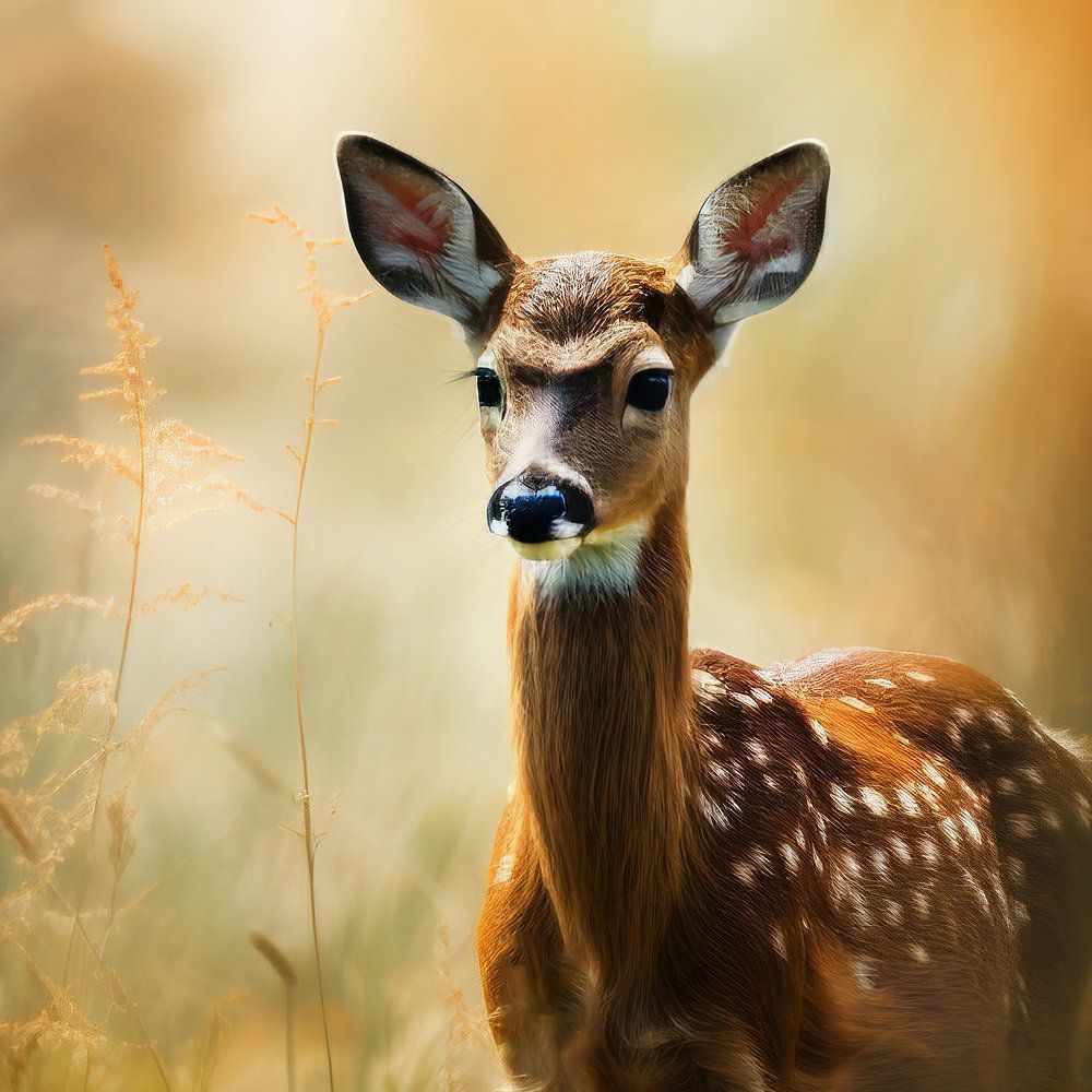This young fawn is enjoying the late afternoon sunshine. The yellow-gold glow shines over his'n body. The blurry background gives it a dreamy look.