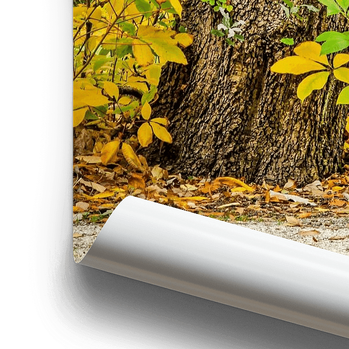 A classic park bench, in an undisclosed location, along a gravel drive, under a slightly leaning old oak tree. The season is immediately obvious though; the beautiful yellow colour of the foliage leaves little doubt that it is autumn. With its simple tessellation, beautiful surroundings and inviting bench, this picture exudes tranquillity.