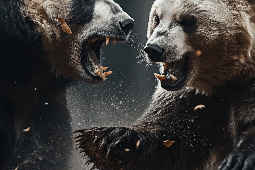 In an epic confrontation between forces of nature, a giant panda unleashes its indomitable power against an equally imposing brown bear. The energy between them splashes like sparks in the air, every move imbued with a titanic struggle for supremacy. Muscles tense, claws sharp as weapons, they create a storm of strength and power. The atmosphere vibrates with the sheer intensity of this epic battle between the titans of the bear kingdom.