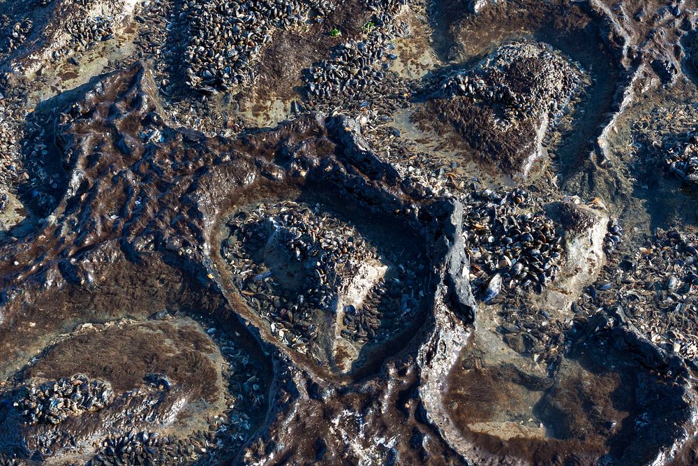 Close-up van een geasfalteerde golfbreker bij het Noordzeestrand van Texel. De erosie van wind en zeewater is zichtbaar. De foto is gemaakt in het voorjaar van 2016.