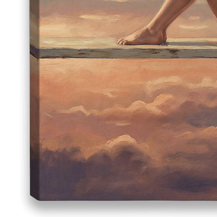 This painting captures a moment of serene introspection, where the boundaries between reality and imagination blur. As the artist, I sought to create a dreamlike tableau that invites viewers to pause and reflect. The two women, dressed in identical red swimsuits and caps, sit back-to-back on a weathered wooden platform, suspended high…