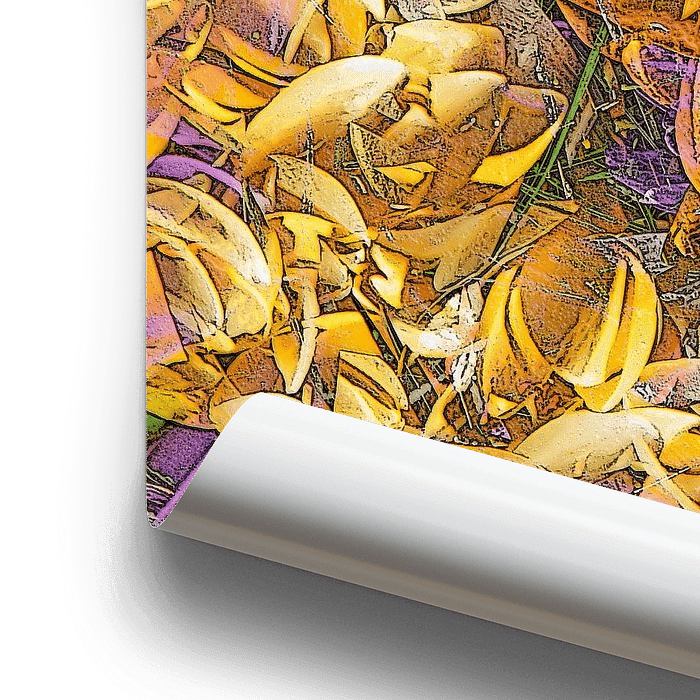 A lively kaleidoscopic image in mainly yellow tones with purple and green accents, made by copying, rotating and blending a photo of crocuses on a sunny day in spring.