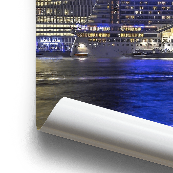 The 300 meter long and beautifully illuminated cruise ship Aida Perla is moored at the cruise terminal on the Wilhelminapier in Rotterdam during the blue hour after sunset.
