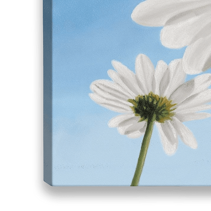 Soft pastel drawing of white daisies, seen from a low viewing angle. The flowers stand out nicely from the sky, which is bright blue on a sunny day in spring or summer.