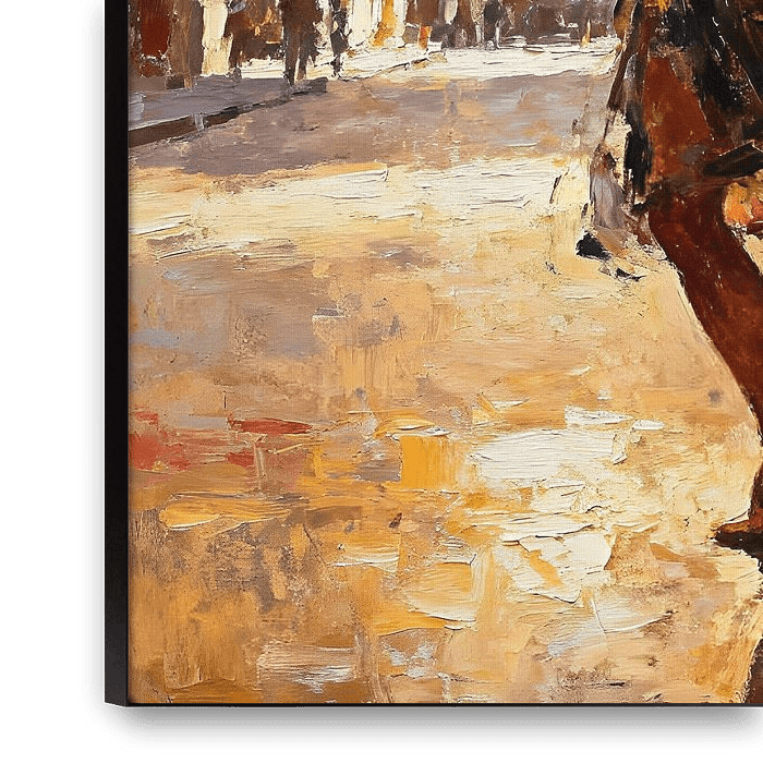 This impressionist oil painting captures a fleeting, poetic moment as a ballet dancer twirls gracefully across a sunlit cobblestone street. Her dark hair, neatly tied back, frames a serene yet focused expression, while her patterned, flowing dress blooms outward in soft, rhythmic motion. With arms outstretched and posture refined, she…