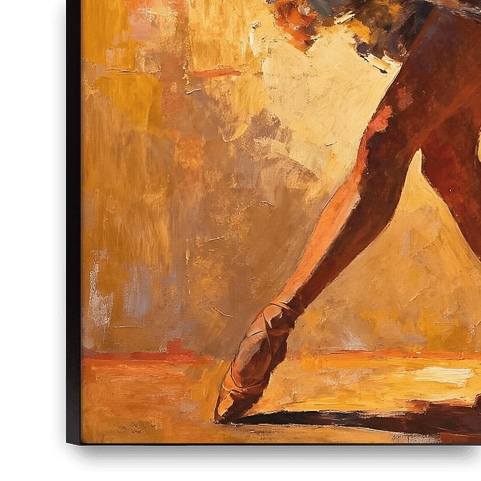 This captivating painting presents a ballerina suspended in a moment of pure movement, her form embodying both strength and grace. Dressed in a dark, intricately detailed costume, she is captured mid-dance, her arms elegantly extended and her legs arranged in a classical ballet stance that speaks to discipline and artistry. Beneath the…