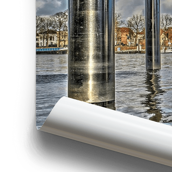 A look under the ferry pier at Worp Park on the bank of the river IJssel, opposite the town of Deventer. The pier was built as part of the Room for the River project, on the site of the former pontoon bridge. Through the sturdy steel construction we see the skyline of Deventer, dominated by Lebuïnus Church.
