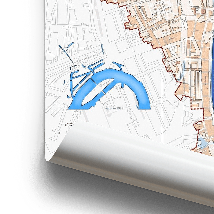 This double plan 1939/Now shows those two cities. The large blocks of modern Rotterdam are projected over the finely meshed pre-war town. Also the change in the watercourses is visible. The map also demonstrates how many old streetnames returned in the new city, although often on rather different locations.