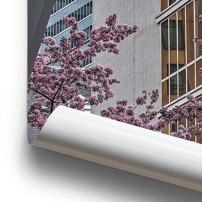 Blossoming cherry trees on Bulgersteyn, a street in the center of Rotterdam. In the background the Erasmus House, also known as the HBU building, a national monument built in 1940, designed by architect W.M.Dudok.