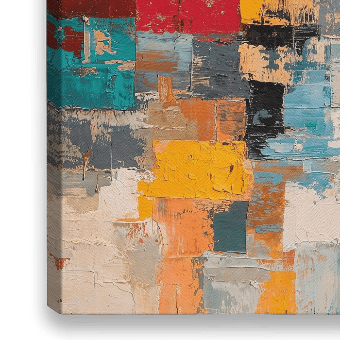 An abstract painting with a vibrant and structured appearance. The composition is dominated by a grid-like structure, but with irregular and overlapping rectangular shapes. The colour palette is diverse, with a mix of warm and cool tones. The brushstrokes are visible and thickly applied, creating an impasto effect. The overall…