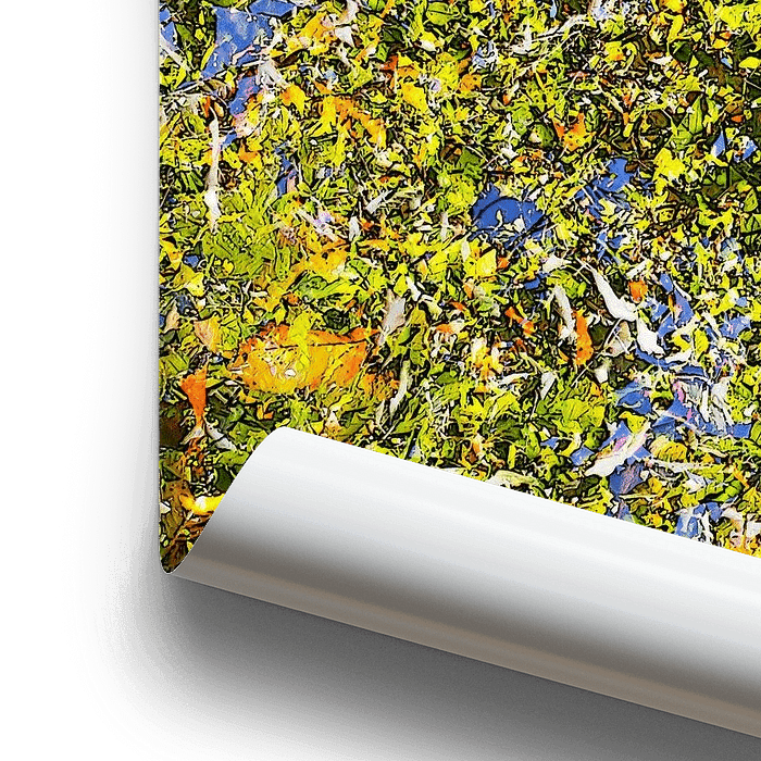 A colourful and lively image, with the yellow and light green tones of the beginning of autumn, based on a photo of the leaves of a beech tree against a blue sky.