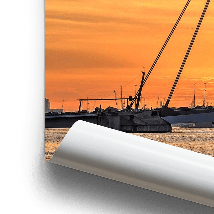 A sensational sunset in Rotterdam. The sky behind the famous Erasmus Bridge and the water of the Koningshaven color orange as if it were King's Day . On the right we see the quay of Noordereiland; in the background we can spot that other icon of Rotterdam; the Euromast.