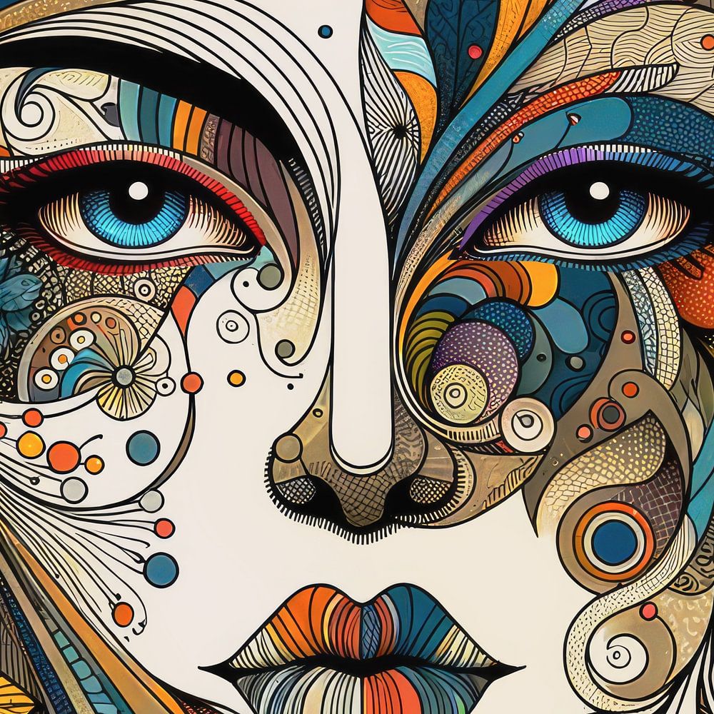 The composition is composed of a complex network of patterns and floral elements, intertwined like a dance of shapes and colours. Each curve, line and petal contributes to the story of the connection and harmony between the human spirit and nature. The face seems to be enveloped by nature, as if the elements express themselves freely through its contours.