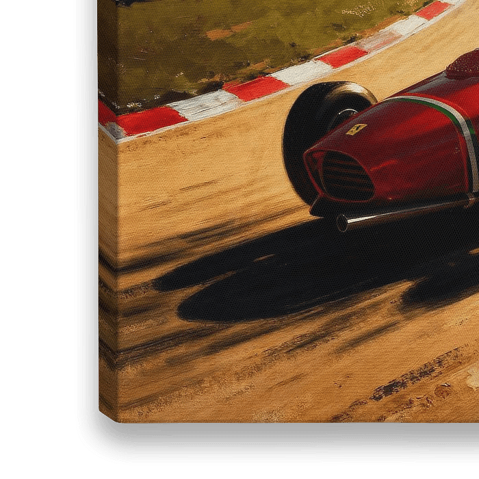 The painting captures the iconic Ferrari 156 Sharknose from 1961, a masterpiece of automotive design, as it roars through the legendary Monza circuit's banked curve. From the artist's perspective, this piece is a celebration of speed, engineering, and the golden era of Formula 1 racing. The vibrant red of the Ferrari dominates the…