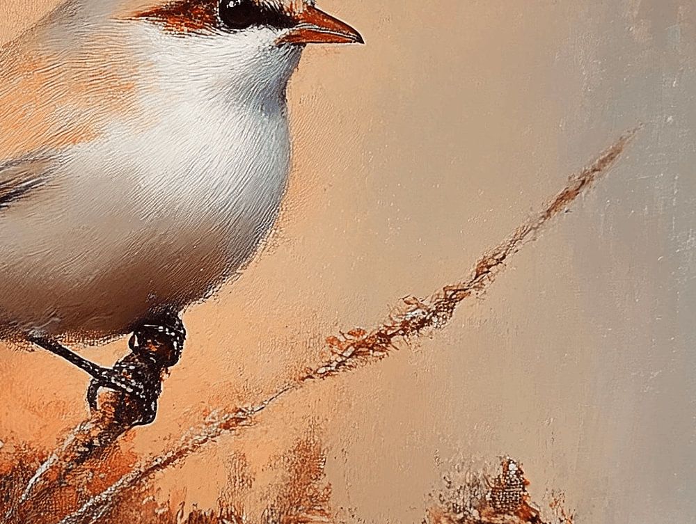 This artwork is based on one such photo of a Bearded Warbler, combined with an abstract, flowing background. Using MidJourney, I processed it further, resulting in a painterly image of this beautiful bird. The warm colours give the atmosphere of an early morning, while cooler tones recall winter walks.