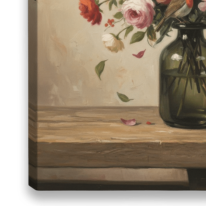Stylish and warm floral still life in oil painting style, featuring a full bouquet in rich shades of red, pink and cream. The flowers are set in a classic green glass vase, giving the scene a calm and warm feel. A robin sits subtly among the flowers, while butterflies and swirling leaves give the painting a lively and natural…