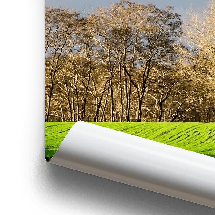 A gently rolling landscape near Zuidwolde, in the south of the province of Drenthe, The Netherlands on a day in January. A dark sky hangs over the fields and forests but the low sun shines through a hole in the clouds and sets the forest edge in a fairy light.