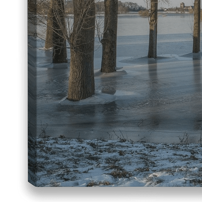 Near Rijswijk on the Rijnbandijk. On the right the skaters at mill De Hoop. Between the trees, on the other side, Wijk bij Duurstede with its three historical monuments: the Grote Kerk, St. Johannes de Doperkerk and Molen Rijn en Lek.