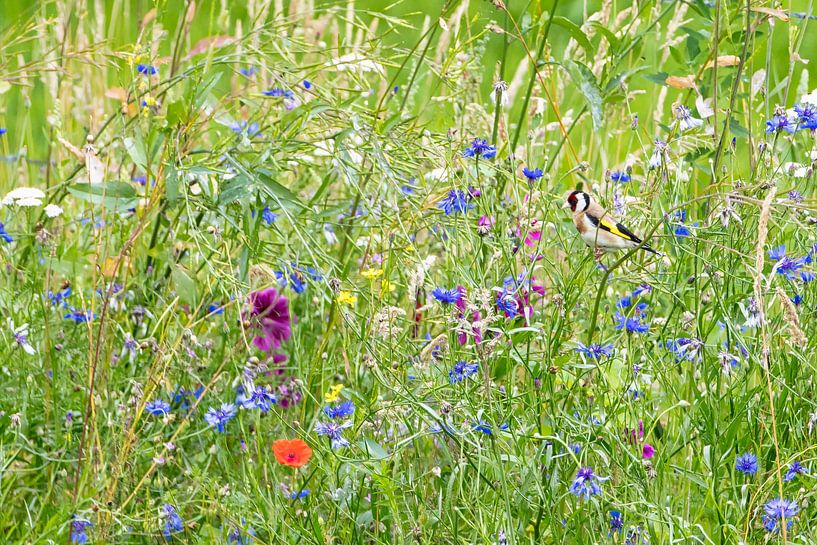 Goldfinch in colourful wildflower field. by Frans Lemmens
