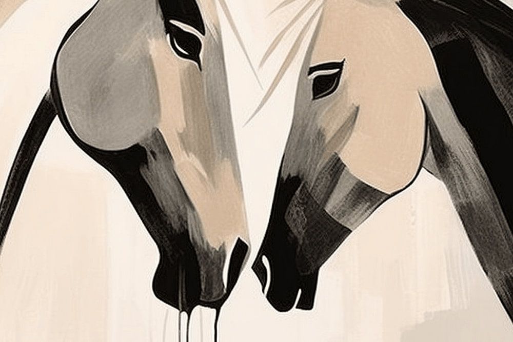 A sophisticated and mesmerising art composition depicting two horses in a minimalist line style, infused with a vintage watercolour pattern of black and beige. The abstract texture and neutral abstraction create a harmonious contrast on a bright white background, placed on an intriguing two-tone background. This artwork, inspired by Gothic pop style, contain delicate gold detailing, creating an illusory effect as wallpaper. The combination of dark black and beige tones with geometric shapes and patterns results in a playful, imaginative illustration that fits perfectly into contemporary interiors.