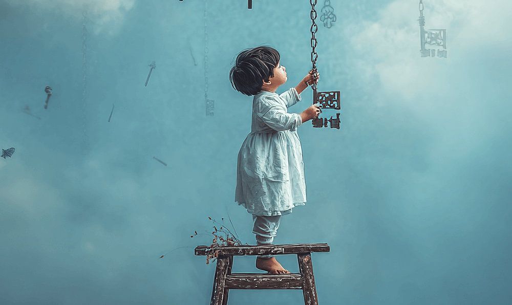 Child on steps among clouds, surrounded by floating keys, in a magical atmospheric landscape.