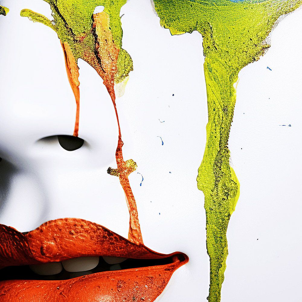 The contrasting colours in this artwork - the pure white of the face, the fiery red of the lips, and the expressive green-blue tears - create a dynamic and dramatic look. The white symbolises purity and neutrality, while the red lips exude passion and power. The green-blue tears add a sense of sadness and emotion, creating a complex and intriguing image that grabs the attention of any viewer.