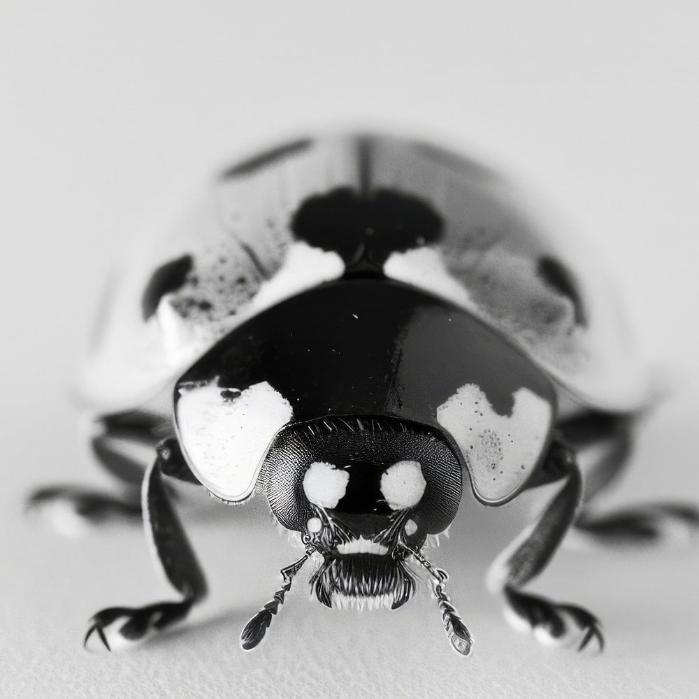 This black and white portrait of a ladybird impressively captures the fine details and natural elegance of this small insect. The high-contrast lines and clear structure of the body give the image a special depth and fascination. Ideal for lovers of macro photography and decorative art, this artwork will add a subtle yet striking touch to your living or working space.