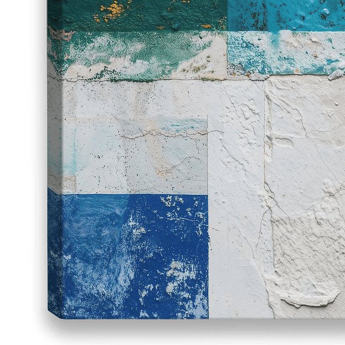 An abstract painting characterised by a dynamic interplay of geometric shapes and vibrant colours. The composition is a grid-like arrangement of different coloured blocks, each with a textured surface, creating a harmonious interplay between the colours and textures. The background is largely white to emphasise the vibrancy of the…
