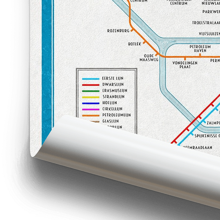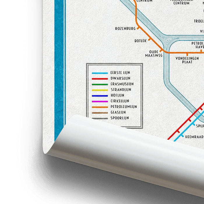 A map of the Rotterdam metro network, as it could look in 2050. With three new lines: the Circle line, the Petroleum line and the Glass line. Design inspired by the legendary 1934 map of the London Underground by Harry Beck.