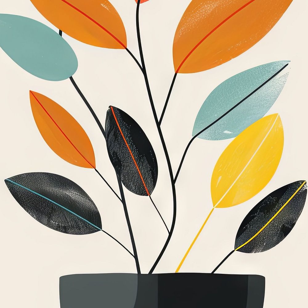 This minimalist plant illustration shows a stylish depiction of colourful leaves in a simple vase. The bold colours and clean lines blend harmoniously into any modern interior. An ideal work of art for nature lovers and those who prefer a simple yet vibrant design. Perfect for living rooms, offices or bedrooms to create a calming and refreshing atmosphere.