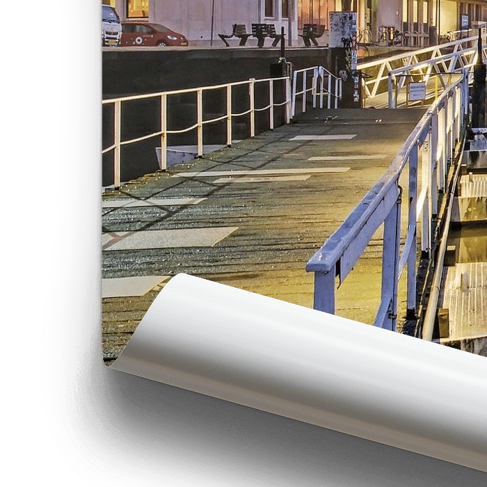 The almost motionless water of the harbour adds to the atmosphere. It reflects and blurs the red lightship, the yellow jetty, the historic floating equipment, the lanterns and the modern architecture. In the left foreground the, also, historic pontoon bridge adds some extra depth to the image.