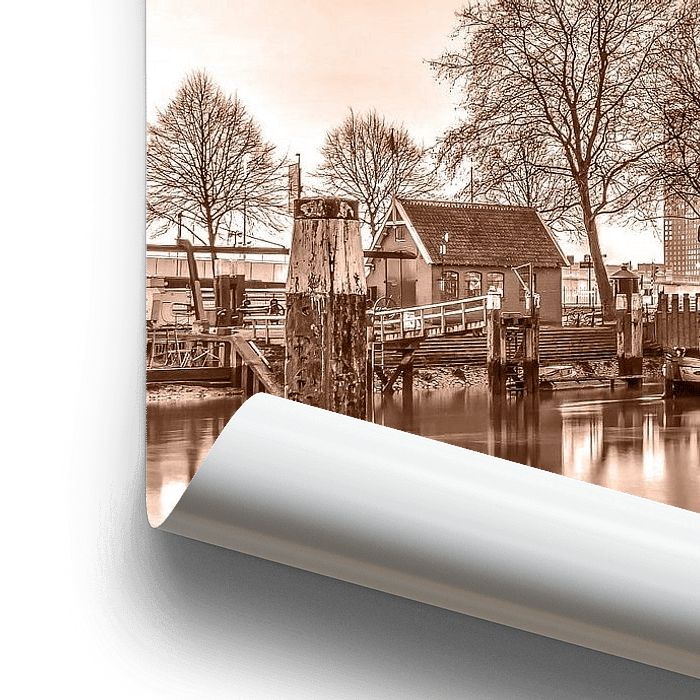 A monochrome image in sepia tones of the White House and the Old Harbor in Rotterdam in the early morning. In the foreground are some historic vessels, in the background the Erasmus bridge and De Rotterdam building are visible.