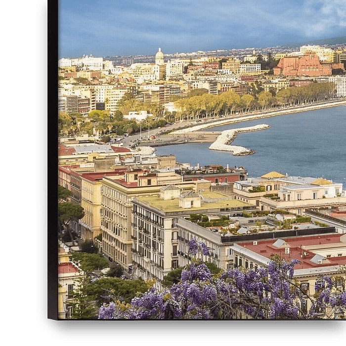 A picturesque view from the Posillipo hill in Naples, which combines nature, city and history in perfect harmony. In the foreground, the scene is adorned with a sea of purple blue rain flowers, framed by fragrant greenery and Mediterranean pines. Behind it, the city of Naples spreads out in all its diversity along the gulf; with elegant…