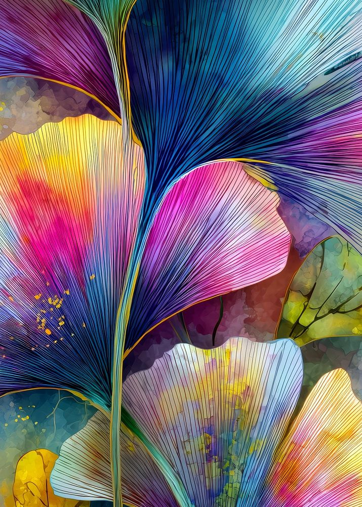 This is a watercolor painting featuring several ginkgo leaves in a vertical composition. The leaves are colored with a vibrant mix of yellow, purple, pink, and blue hues, creating a colorful and eye-catching display.